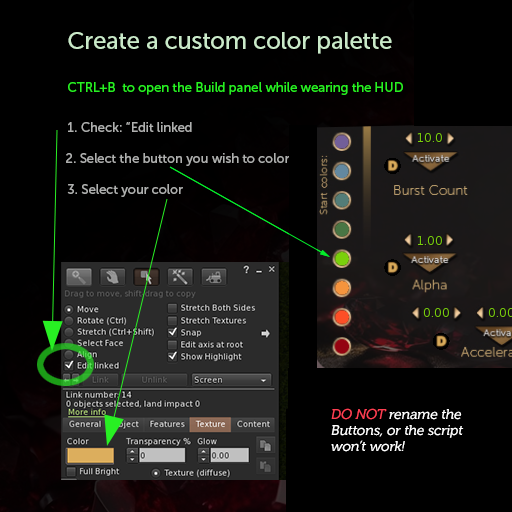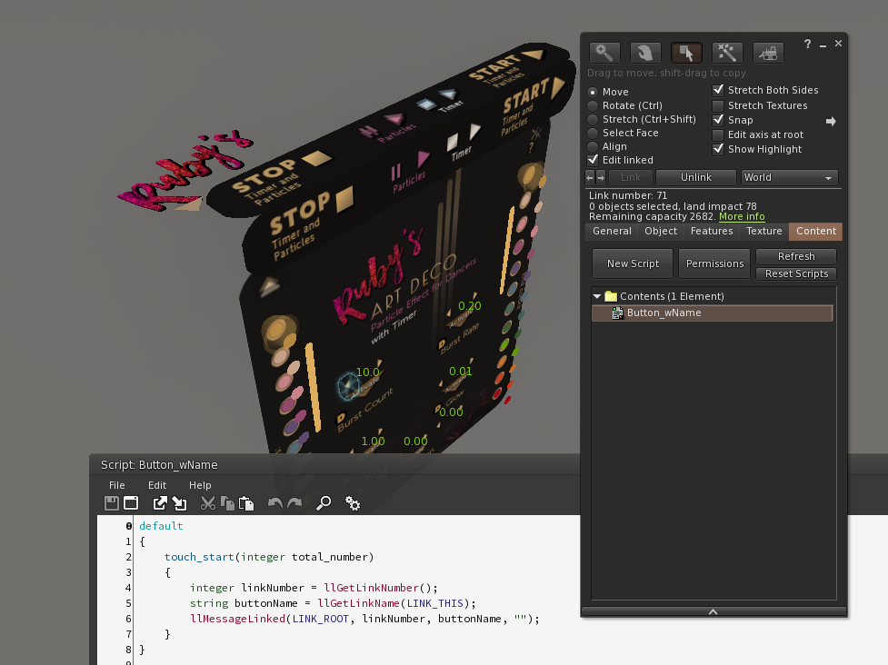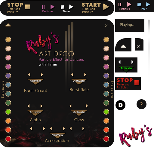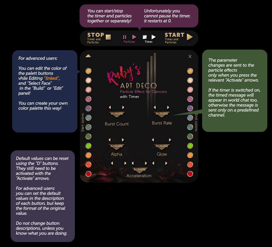I am not a professional coder, I learned lsl scripting in June 2023 (with the help of chatGPT that helped explaining some core concepts), but I wanted to create a HUD that works with particle effects during dance choreographies.